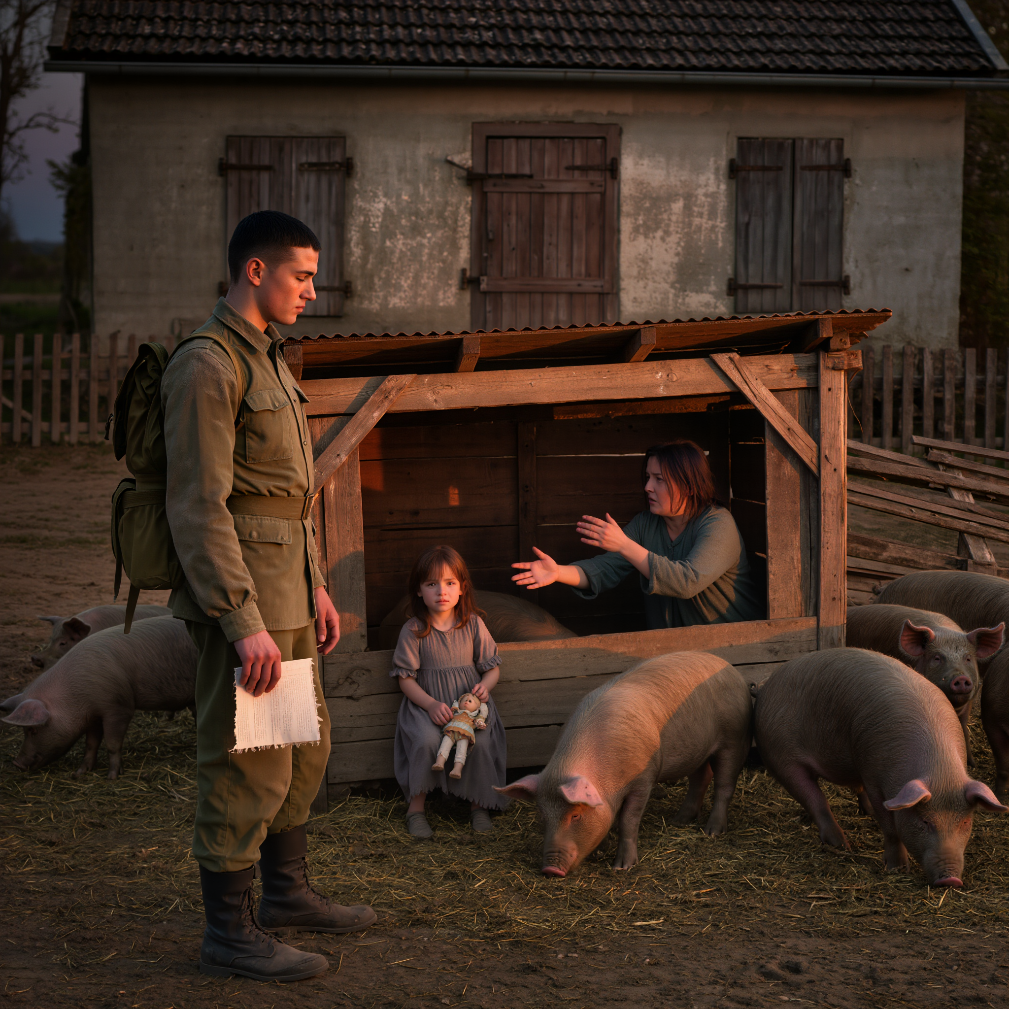 As he approached his house, the cries of a child pierced through the quiet afternoon, coming from the direction of the pigsty. His pace quickened, heart pounding in his chest, the military instinct kicking in. He rounded the corner of the house and stopped short at the sight that met him.