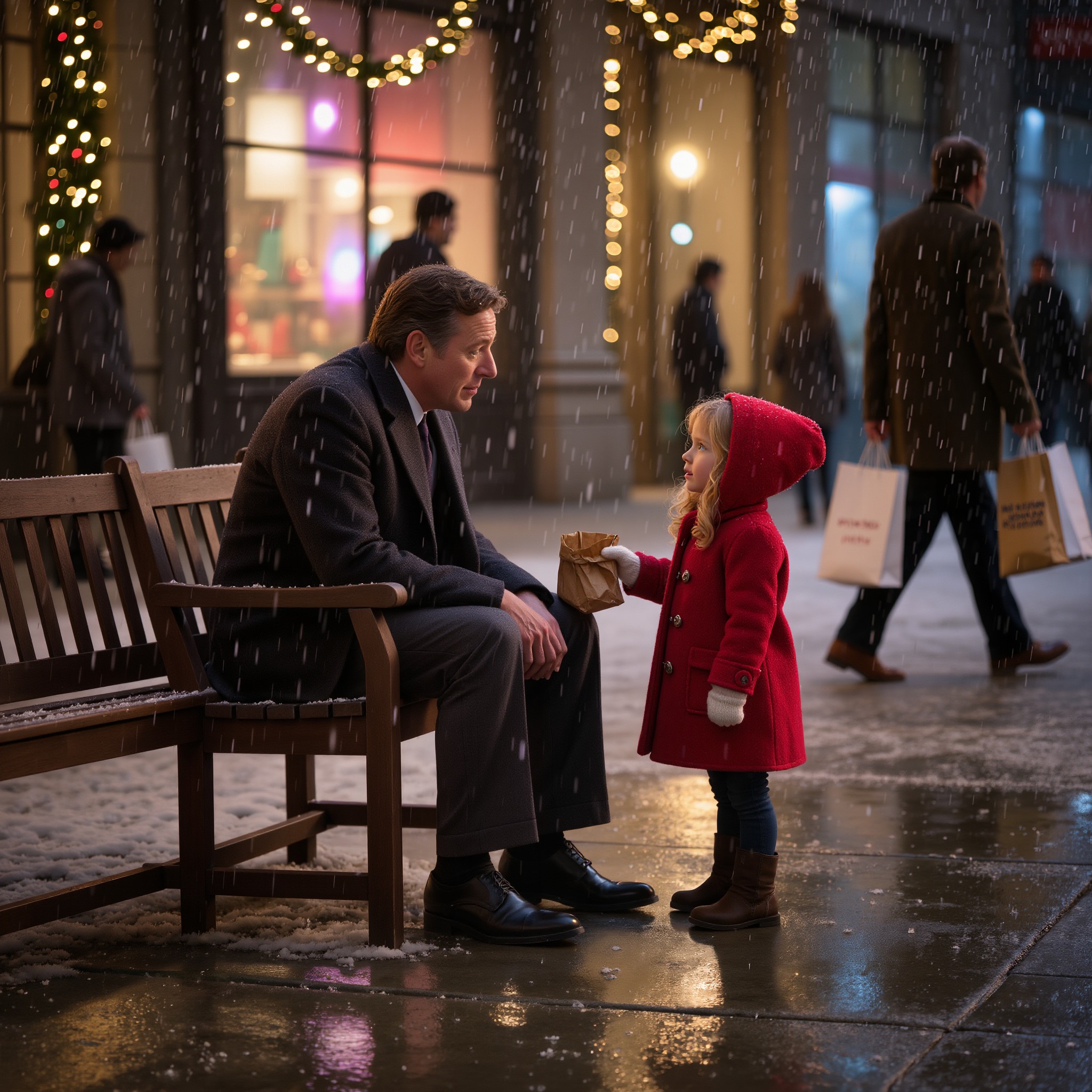 Then, a new sound cut through the urban hum—a soft, hurried shuffling of small feet, almost too light to register against the pavement. Jake opened his eyes. Standing before him, framed by the gentle swirl of falling snowflakes, was a little girl. She couldn’t have been more than three or four, with a riot of golden curls escaping from beneath the hood of a well-loved red coat. Her eyes, a startling shade of cornflower blue, held a universe of earnest hope. In her small, mittened hands, she clutched a crumpled paper bag as if it contained a priceless treasure.