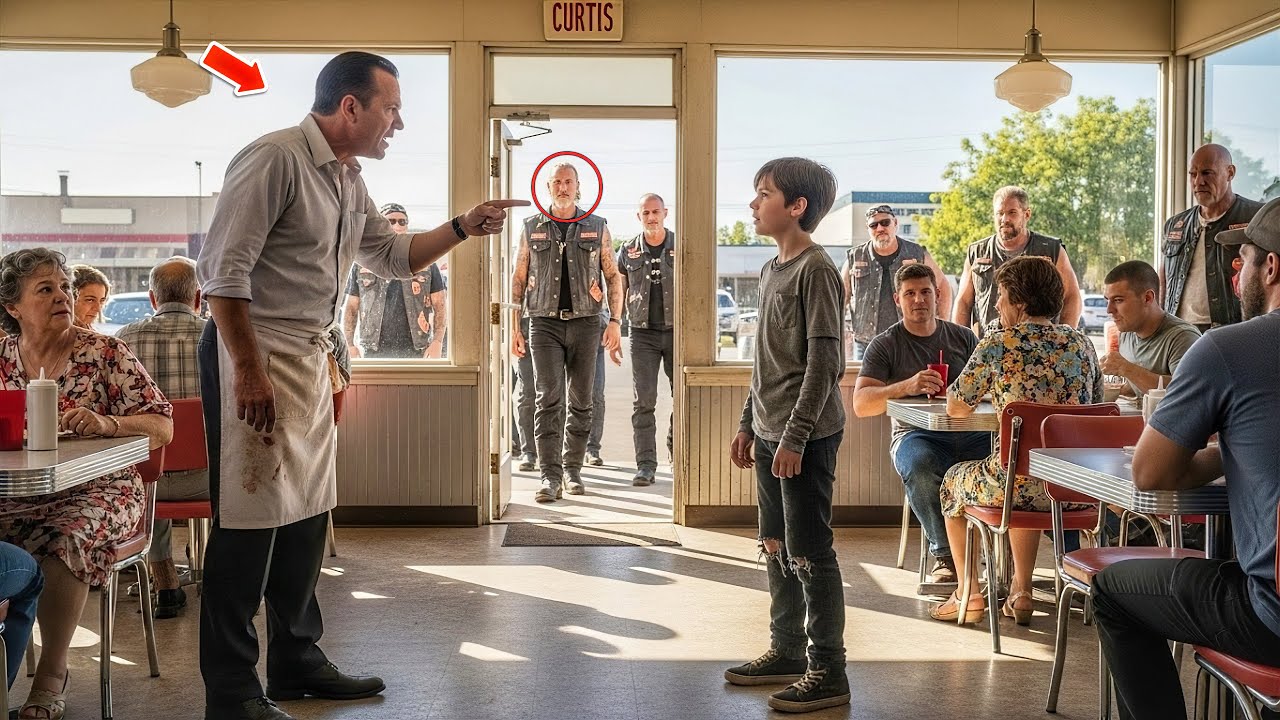 Behind the counter, Curtis worked in brittle silence. Customers who’d ignored Mason now whispered to each other with a new guilt, realizing they too had watched a child be thrown into heat and done nothing. The air changed. A lesson got written in daylight with plates of food and leather jackets for ink.