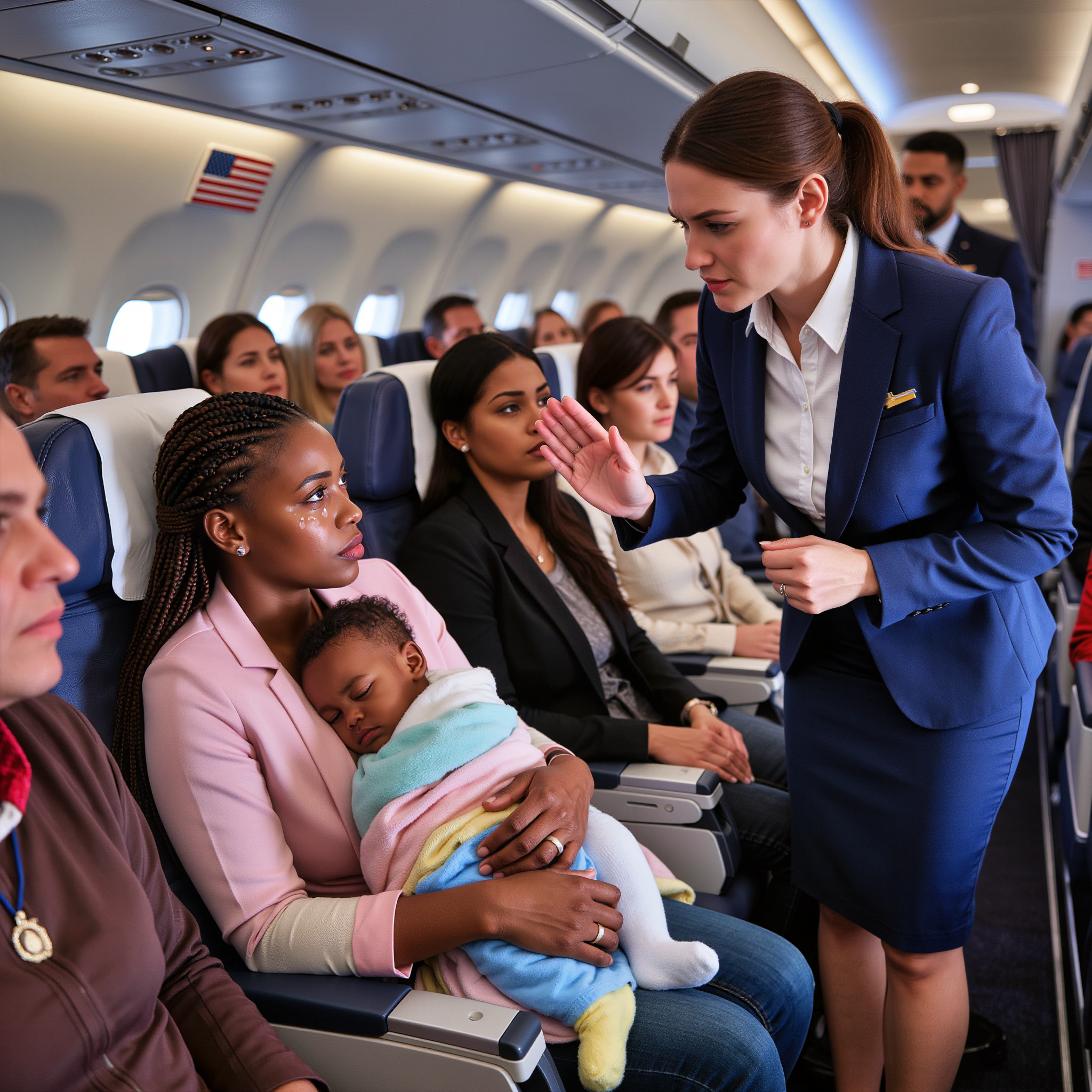 Kesha remained composed—no raised voice, no arguing, no demands. Her calm felt unsettling, like someone who knew something the others didn’t. Baby Zoe quieted, responding to her mother’s steady heartbeat. The infant’s dark eyes scanned the cabin with unguarded curiosity.
