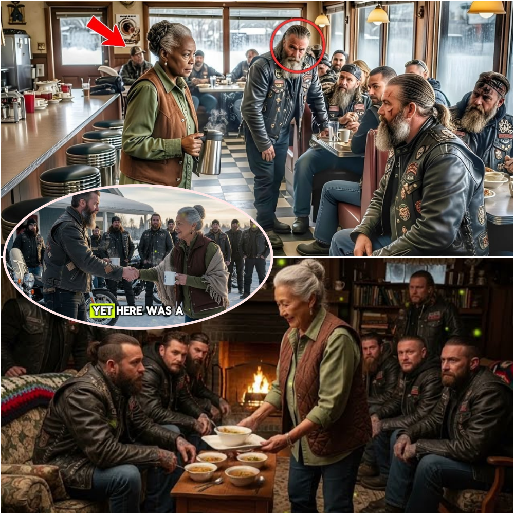 Fifteen men stood there — leather jackets, tattoos, heavy boots covered in snow. Their motorcycles were half-buried outside under the furious wind.